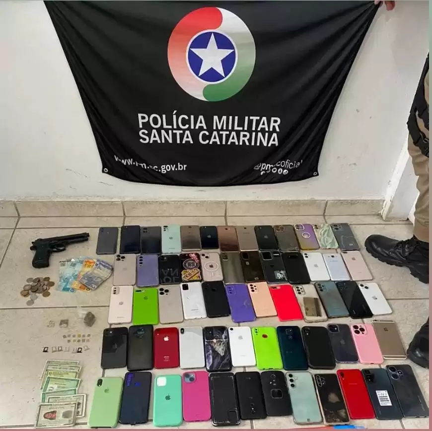 Com eles foram apreendidos 61 aparelhos de telefone celular, um simulacro de arma de fogo, três carregadores de celular, uma corrente, sete documentos de identidades e mais R$ 400 em espécie.