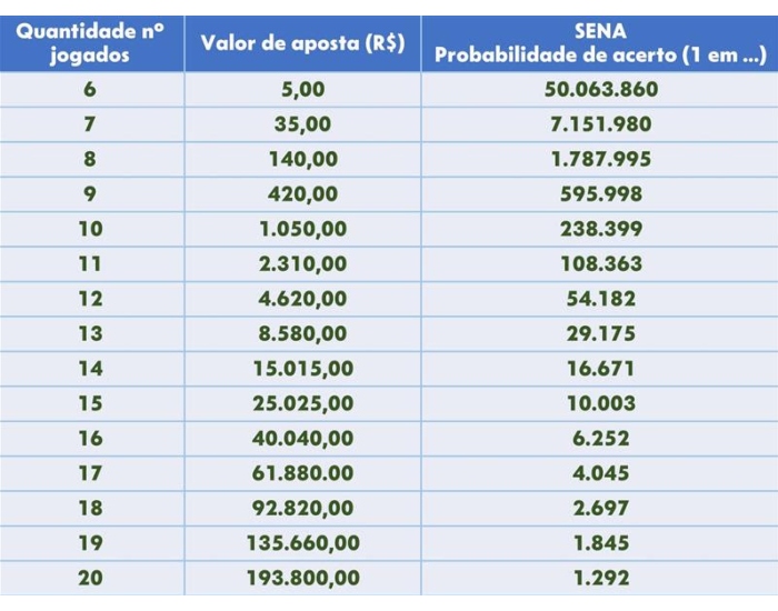 O quadro abaixo traz a probabilidade de acerto em relação à quantidade de números jogados e o valor da aposta: