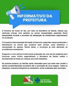 A Prefeitura de Cocal do Sul reforçou, em nota, que nenhuma criança com autismo ou outras necessidades especiais ficará sem assistência durante o período de reorganização dos serviços.