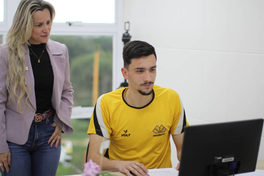 Assistente social do clube, Fabiana Iraci, auxilia os estudos do zagueiro da categoria Sub-20 do Criciúma, Eliédon Pereira. Foto: Celso da Luz/ Assessoria de imprensa C.E.C.