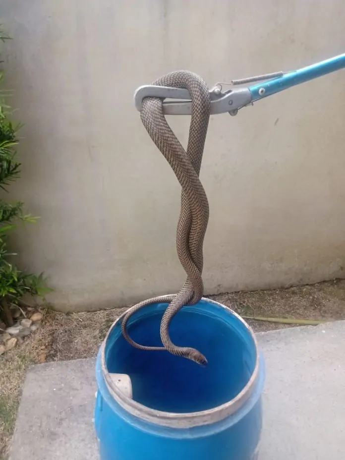 O Corpo de Bombeiros Voluntários de Jaguaruna foi acionado para um resgate de uma cobra em uma residência. Quando os bombeiros chegaram ao local, o animal estava no jardim da propriedade, onde foi capturado. O fato ocorreu no bairro Riachinho, em Jaguaruna.