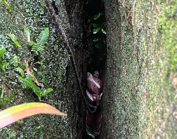 Uma cadela ficou presa entre duas pedras e mobilizou os Bombeiros Voluntários neste domingo, dia 21. O fato ocorreu na localidade de Rio Perdoná, em Treze de Maio.