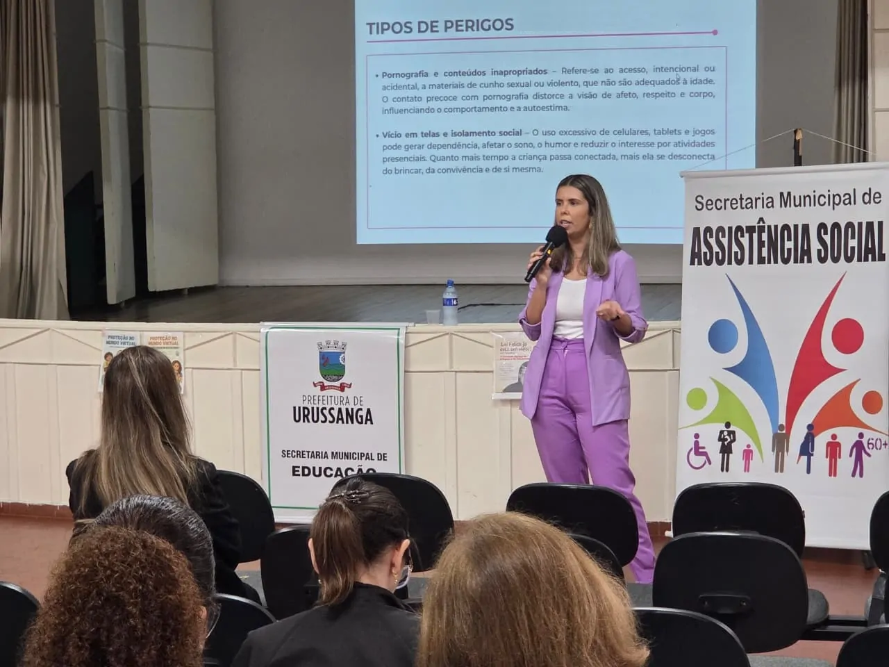 O Conselho Municipal dos Direitos da Criança e do Adolescente (CMDCA), em parceria com a Secretaria Municipal de Educação de Urussanga, realizou nesta sexta-feira, dia 31, uma capacitação sobre “Consciência em Ambiente Digital para Crianças e Adolescentes”. O encontro reuniu autoridades e orientadores educacionais das redes municipal, estadual e particular, com o objetivo de reforçar os cuidados e a segurança de crianças e adolescentes no uso da internet.