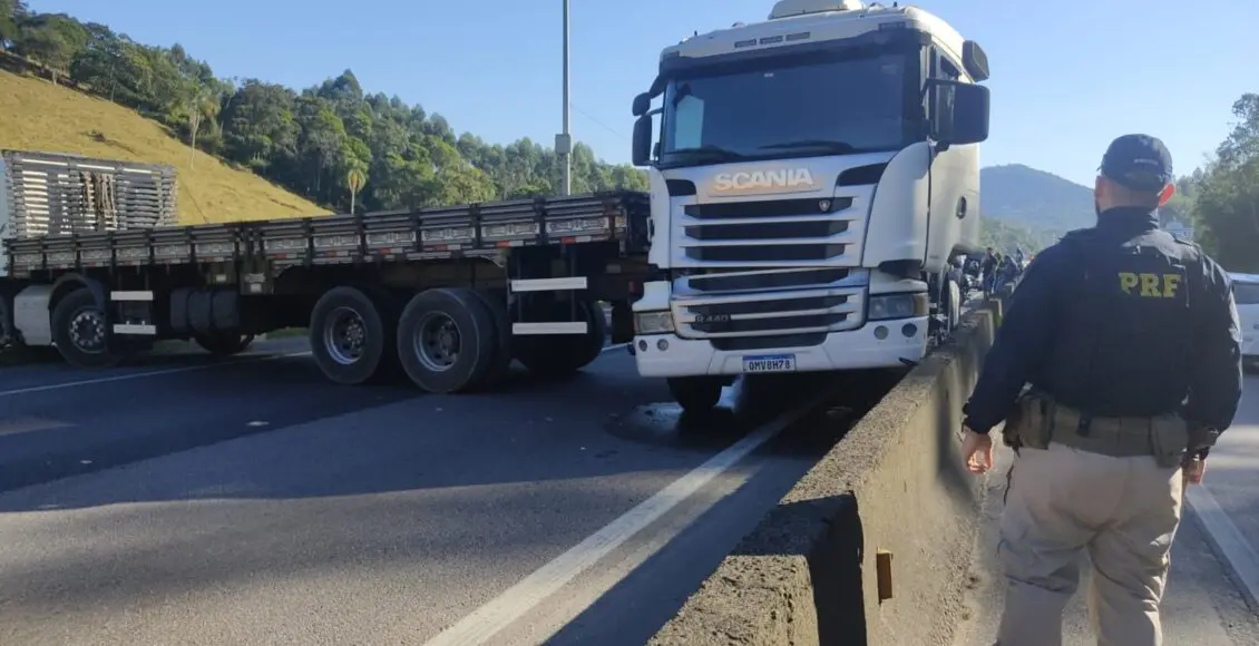 Uma carreta fez um “L” e bloqueou as duas faixas da pista da BR-101 na manhã desta segunda-feira, dia 26, no km 128, em Itajaí. Equipes da concessionária do trecho, Arteris Litoral Sul, já conseguiram desobstruir a pista no sentido Sul (Itajaí-Porto Alegre).