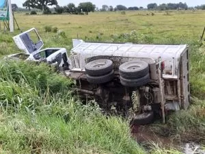 Uma carreta ficou tombada e com a carga espalhada pelo canteiro central após se envolver em uma colisão com outro caminhão e um carro na