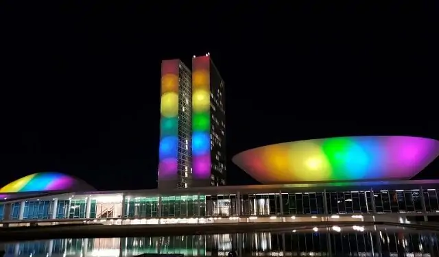 Na noite de quarta-feira (28), o Palácio do Congresso Nacional, onde estão localizadas a Câmara dos Deputados e o Senado, foi iluminado com projeções de luzes em comemoração ao Dia Internacional do Orgulho LGBTQIAP+.