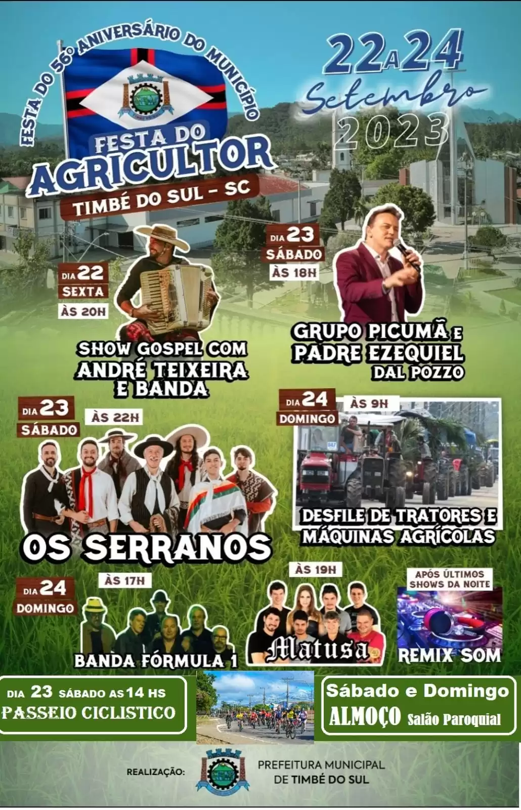 No dia 22, a partir das 7hs a Feira da Agricultura Familiar estará na praça para comercialização de produtos provenientes do município. Às 20hs a festa inicia com o show gospel de André Teixeira e Banda. No sábado, dia 23, dia do aniversário de 56 anos de Timbé do Sul, às 14hs ocorrerá passeio ciclístico, às 18hs Grupo Picumã e Padre Ezequiel Dal Pozzo e às 22hs, show nacional com Os Serranos. No domingo (24), a partir das 9hs o desfile de tratores e máquinas agrícolas, às 17hs Banda Fórmula 1 e logo após, Banda Matusa.