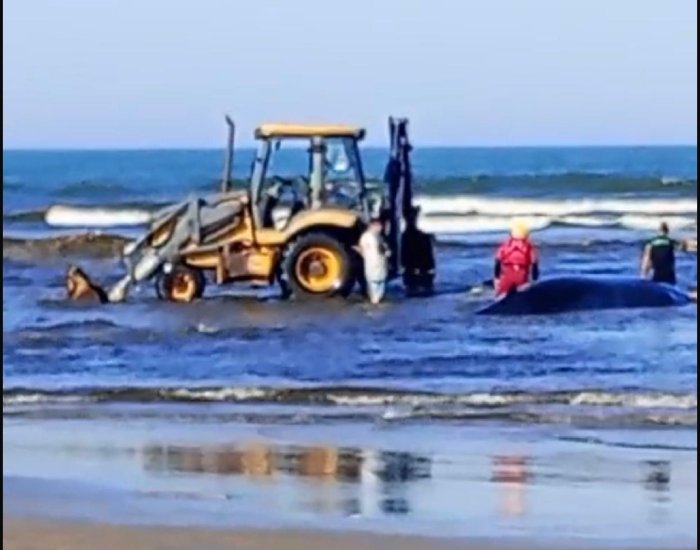 Uma máquina retroescavadeira está no local na tarde desta sexta-feira, dia 14, para retirar a areia e tentar formar um valo ao lado do animal.