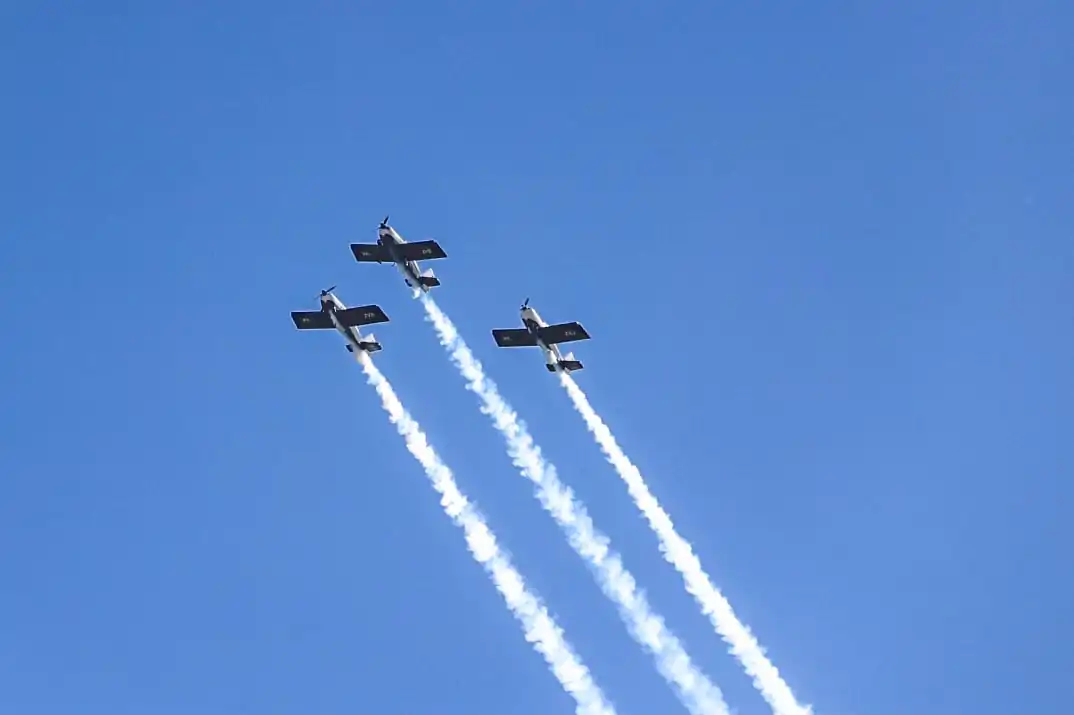 Os pilotos Luiz Alberto Pereira Bianchi, Áttila Raymundo da Silva Filho e Jorge Kersul Filho — com mais de três décadas de experiência na aviação militar — decolaram do Aeroporto Diomício Freitas, em Forquilhinha, por volta das 15h45. Minutos depois, as aeronaves sobrevoavam o parque em formações que arrancaram aplausos, gritos e olhares admirados do público.