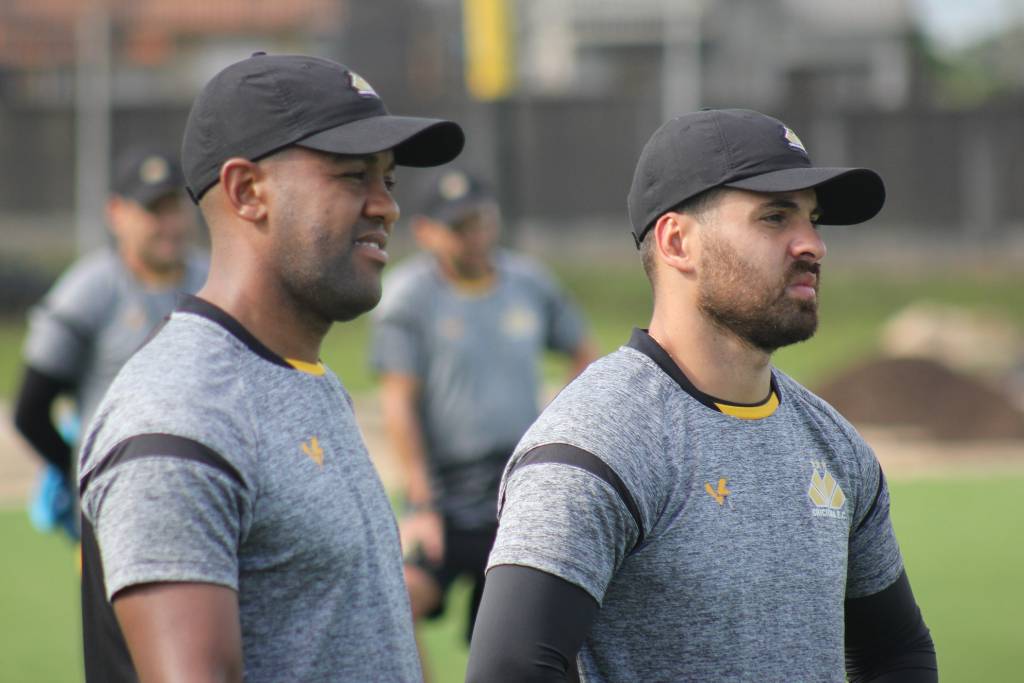 Estagiário do curso de educação física da Unesc, Willian Rodrigues, e o fisiologista Hexael Demarch na pré-temporada do Tigre. Foto: Celso da Luz/ Assessoria de imprensa C.E.C.