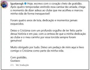 Gustavo Almeida está encerrando um ciclo marcante em sua carreira. Após quatro anos vestindo a camisa do Criciúma, o jogador se despede com palavras de gratidão e emoção, destacando sua dedicação ao clube e o carinho pela torcida. Agora, ele dá início a uma nova jornada no Juventude, onde já começou os treinamentos e aguarda sua apresentação oficial.