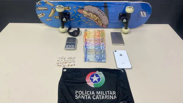 O dono da loja entrou em contato com o anunciante, marcou um encontro para comprar os itens e acionou a PM para prestar apoio. Ao chegar no local, a guarnição viu um homem e uma mulher com um skate em mãos. Ao realizar a abordagem, o homem tirou uma sacola do bolso e tentou ingerir algo, mas acabou cuspindo. Depois, foi verificado que se tratava de 25 pedras de crack, pesando 9,8 gramas.