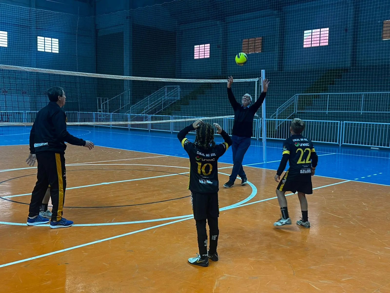 Durante a visita, o prefeito percorreu os espaços internos da arena, conferiu de perto as melhorias feitas e acompanhou um treino da equipe de futsal da cidade. Em clima descontraído, também interagiu com alunos da rede municipal e chegou a arriscar alguns saques na quadra, em meio aos preparativos para o jogo internacional.