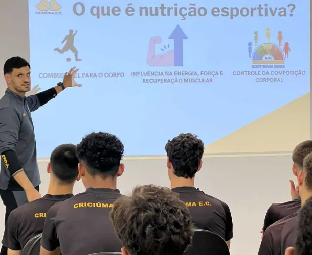 O nutricionista do Criciúma, Victor Corrêa, comandou uma palestra sobre a importância da alimentação adequada para o desempenho e bem-estar dos atletas. A ação, idealizada pela assistente social do clube, Fabiana Iraci, foi realizada com a categoria Sub-17 na tarde desta terça-feira (27/05) no auditório do Centro de Treinamento Antenor Angeloni.