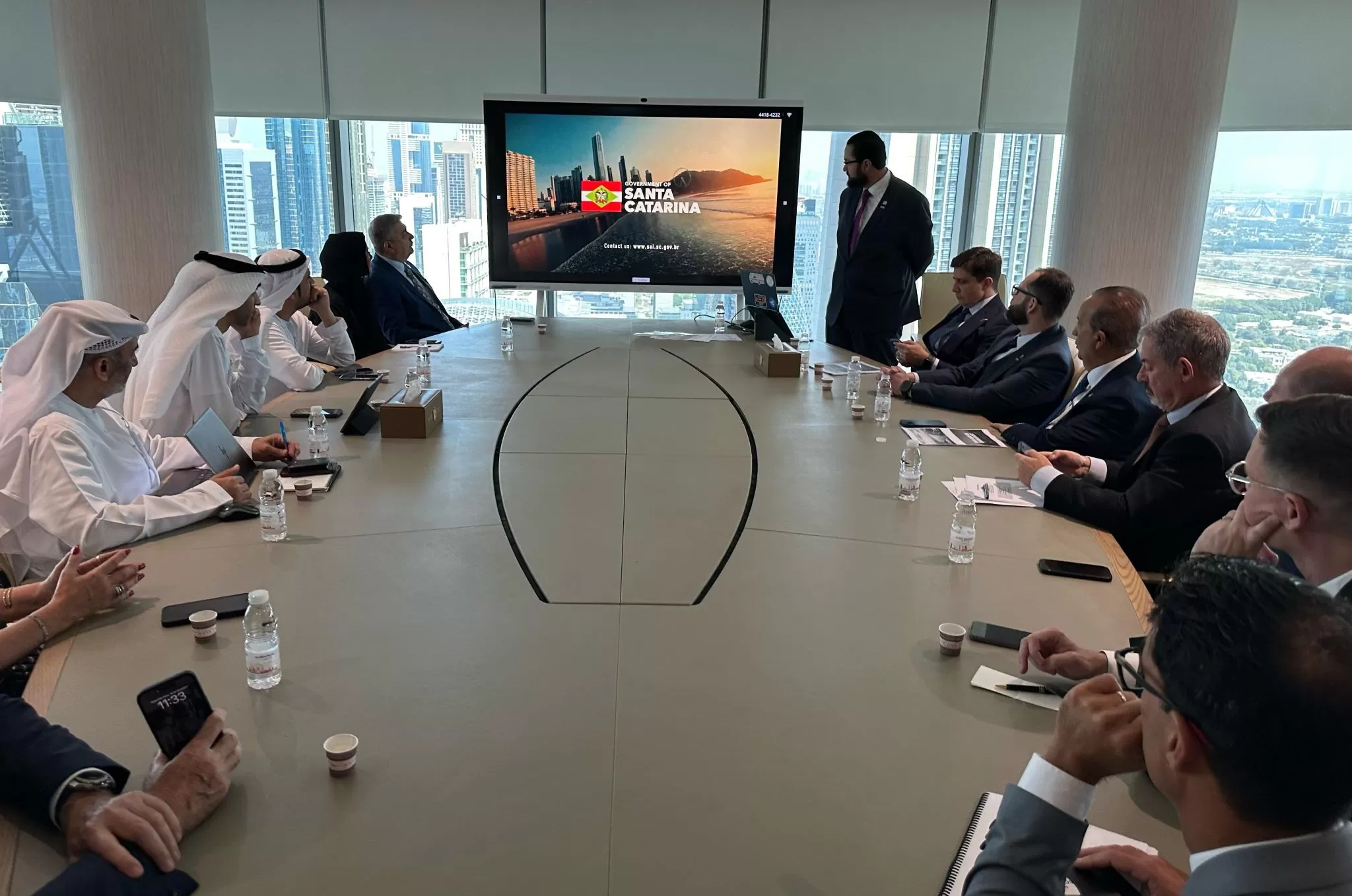 Nesta segunda-feira (19), durante reunião da comitiva catarinense no Ministério do Comércio dos Emirados Árabes Unidos, em Dubai, o chefe da pasta, ministro Thani Zeyoud demonstrou interesse em investir no setor de infraestrutura do estado de Santa Catarina. Essa foi a primeira reunião da missão internacional catarinense aos Emirados Árabes, liderada pelo governador Jorginho Mello.