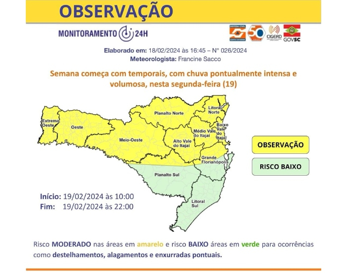 O risco é baixo a moderado para ocorrências meteorológicas como destelhamentos e alagamentos pontuais. Os ventos sopram com fraca intensidade e não apresentam direção predominante. As ondas apresentam alturas entre 1,5 e 2,0 m do quadrante leste. As temperaturas mínimas ficam próximas dos 12/13°C na Serra e variam de 16°C a 22°C nas demais regiões. No período da tarde se aproximam dos 30/32°C no Extremo Oeste, Oeste, Vale do Itajaí e Litoral Norte e variam de 25°C a 29°C nas demais regiões.