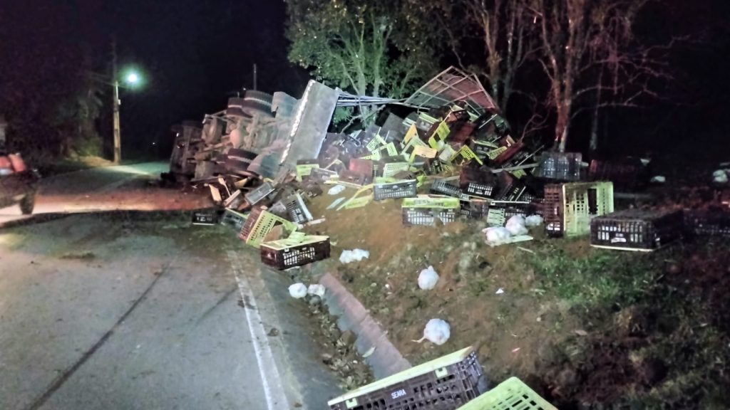 Um caminhão Ford/Cargo carregado de frangos vivos tombou na noite desta última quinta-feira, dia 20, em Siderópolis. O Corpo de Bombeiros foi acionado e se deslocou para a Rodovia Ângelo Moro, no trecho do bairro São Martinho Alto, por volta das 20h.
