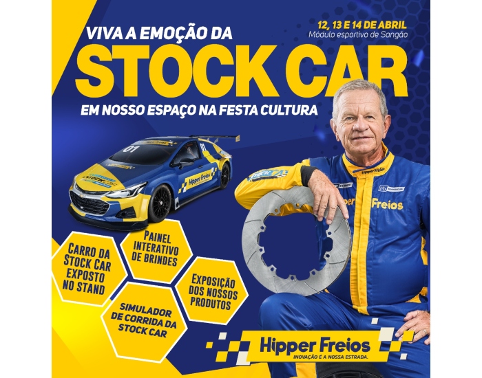 “Viva a emoção da Stock Car em nosso espaço na festa da cultura” uma frase que resume a expectativa de adrenalina e diversão que espera por todos os presentes. Não perca esta oportunidade de fazer parte deste momento de Sangão, onde a cultura e a paixão pelo automobilismo se encontram em um só lugar”, convidam os organizadores do stand da Hipper Freios.
